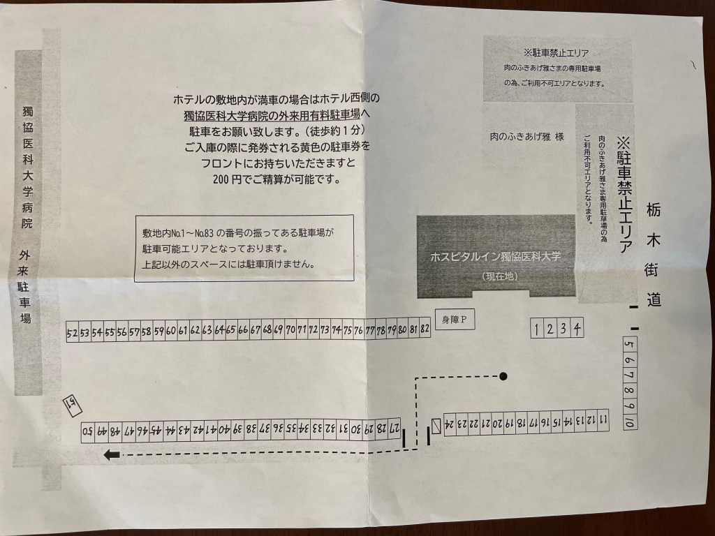 ホテル駐車場が満車の場合は、獨協医科大学の外来駐車場へ🚗
